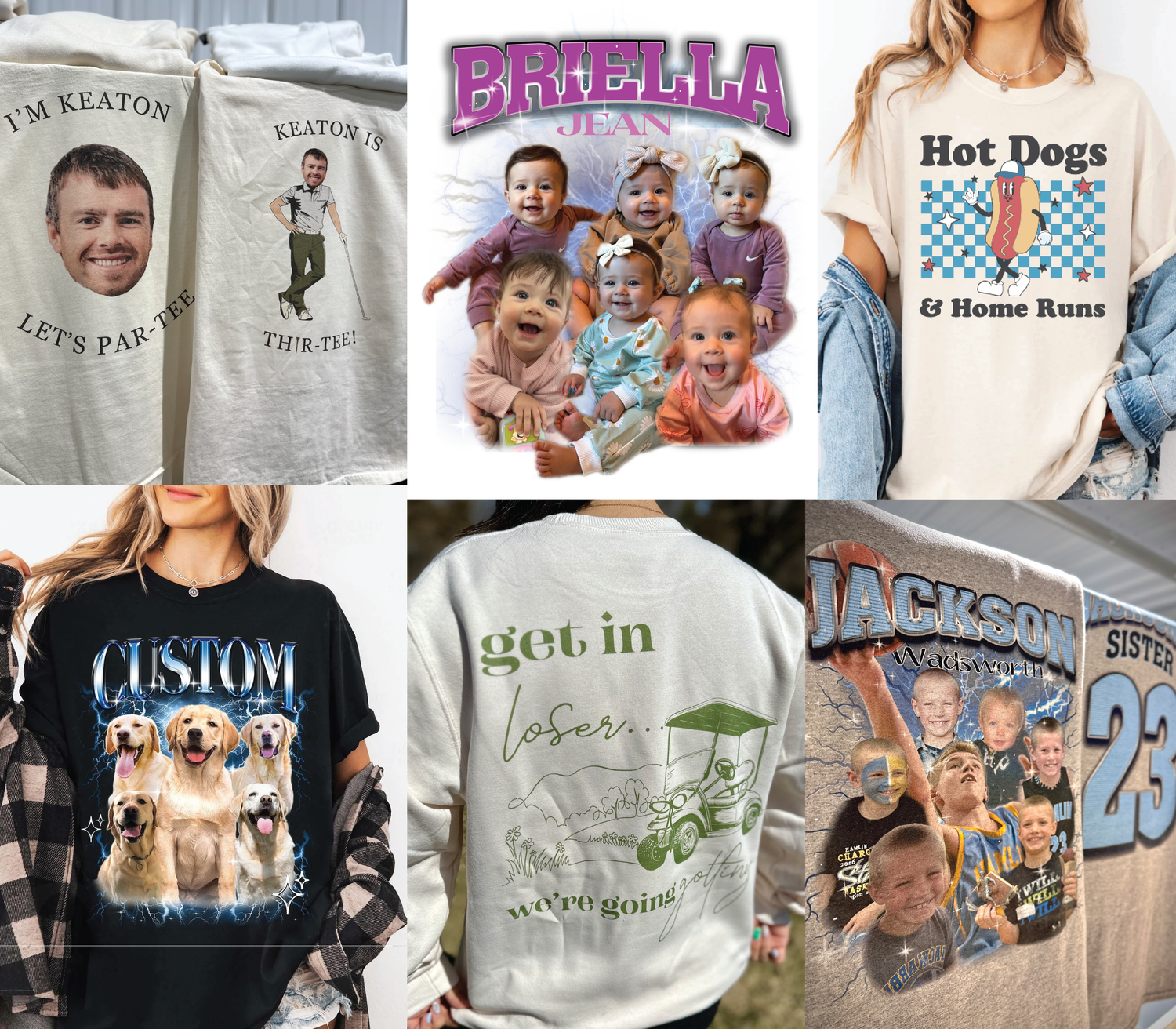 Birthdays, bach/bachelorette parties, or any type of event, these are the best gifts for anyone! Yes, we can even do these for pets! Send us 4-6 photos and we can create these fun shirts for you!